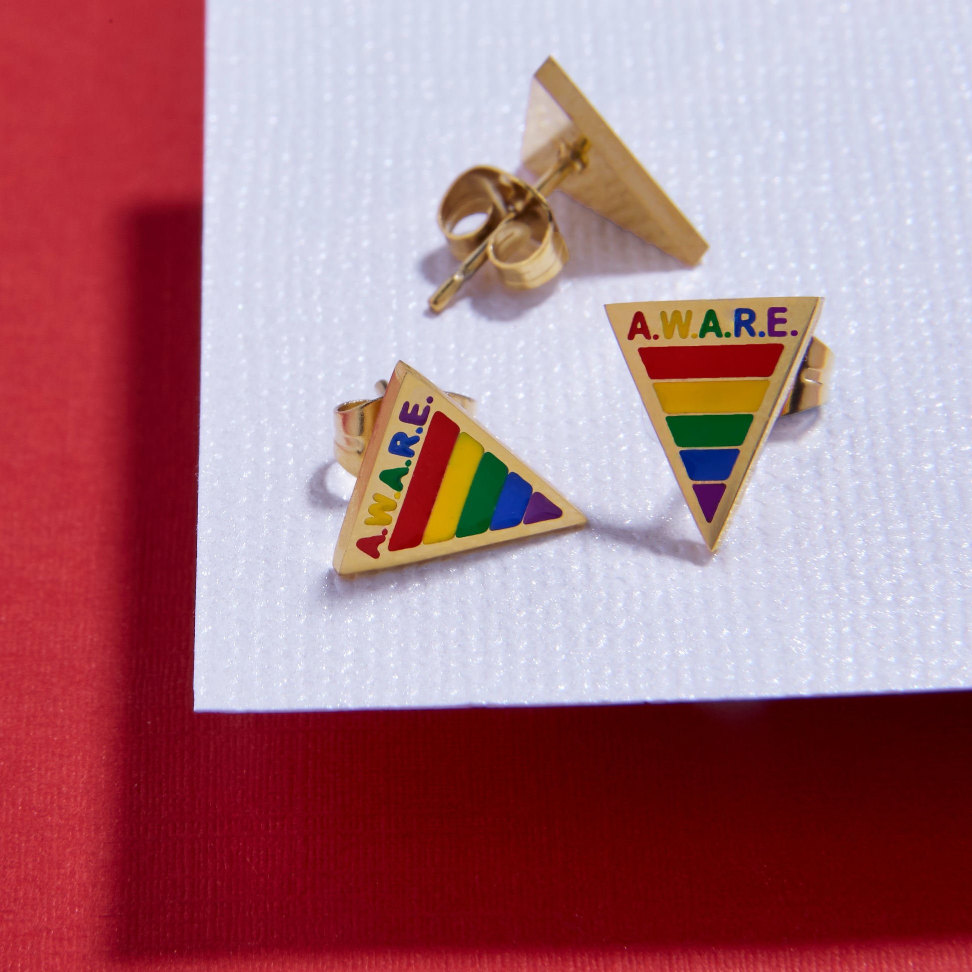 The Rainbow Awareness Earrings are more than just vibrant accessories—they are a meaningful emblem of strength, education, awareness, and support for mental health and important awareness causes. The triangle shape is a powerful symbol of resilience, stability, and the inner strength it takes to navigate life’s challenges. Paired with the inspiring AWARE logo, these earrings represent a commitment to spreading knowledge, fostering understanding, and breaking the stigma surrounding mental health.