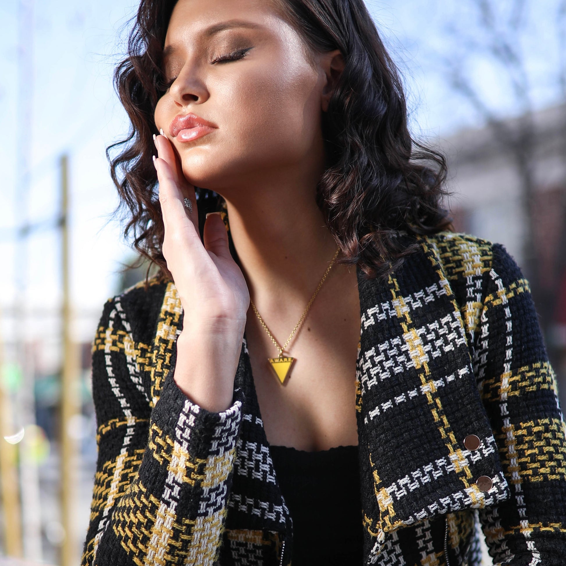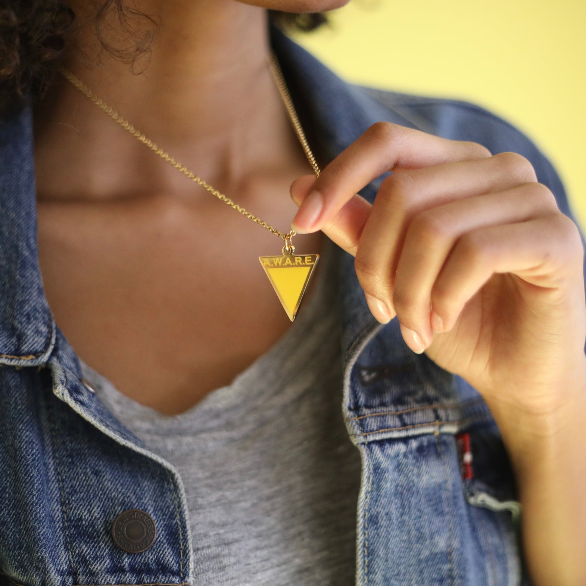 The Yellow AWARE Triangle Necklace is a radiant symbol of hope, positivity, and awareness. The color yellow represents light, optimism, and strength, serving as a daily reminder to find brightness even in the hardest days.